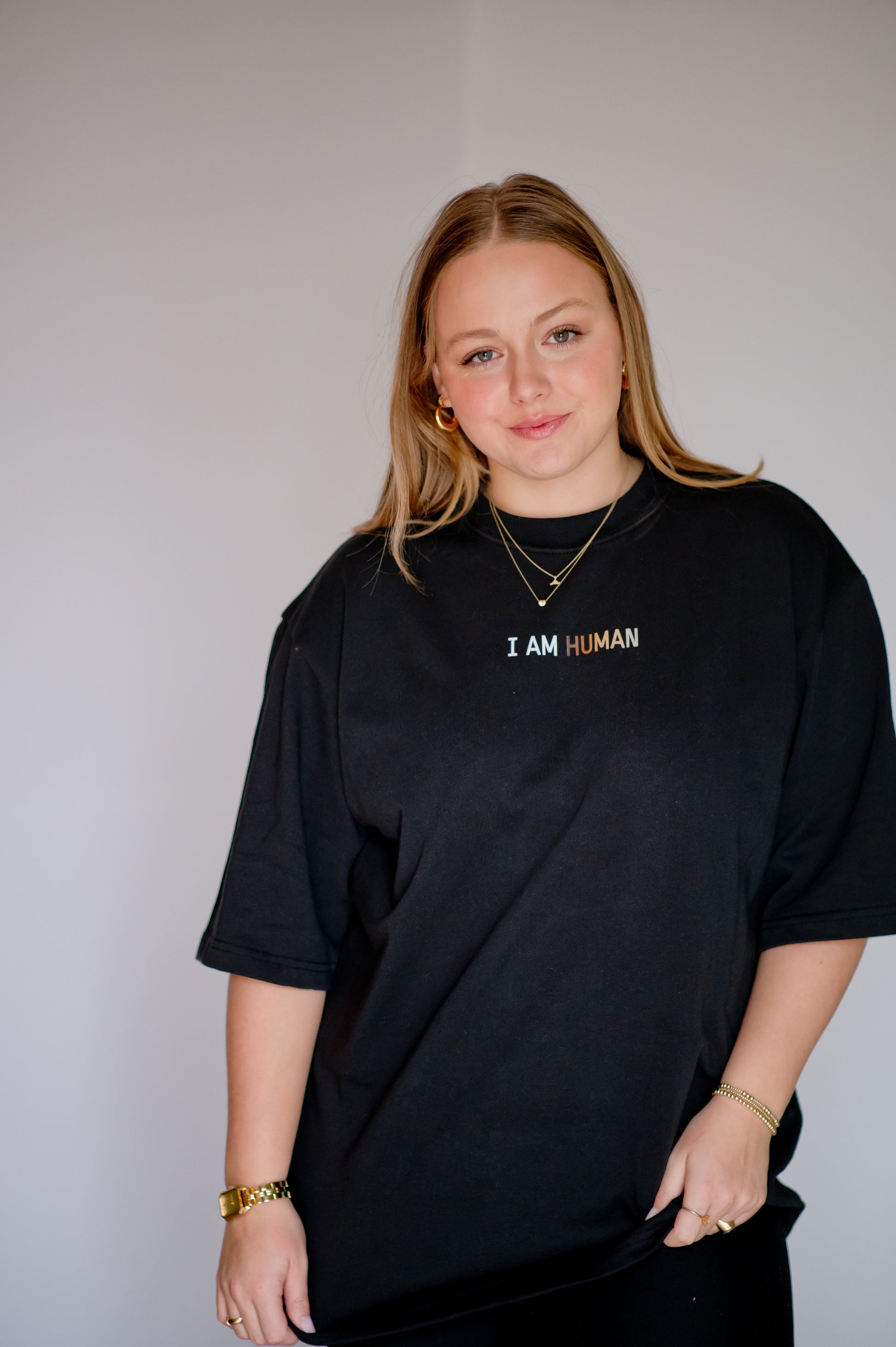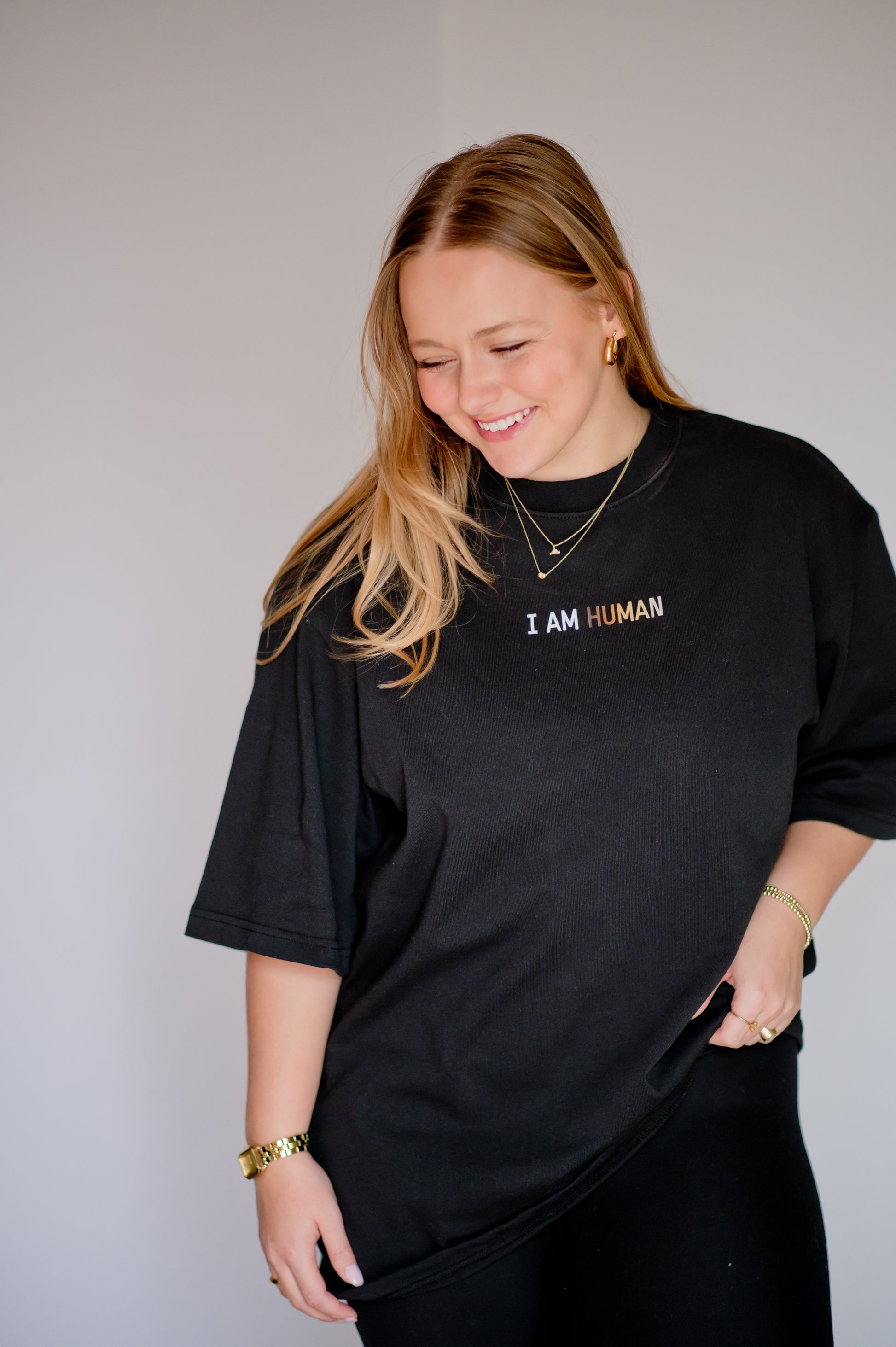 The perfect oversized medium-weight t-shirt with the I AM HUMAN logo printed on the front and smiley frown on the back.